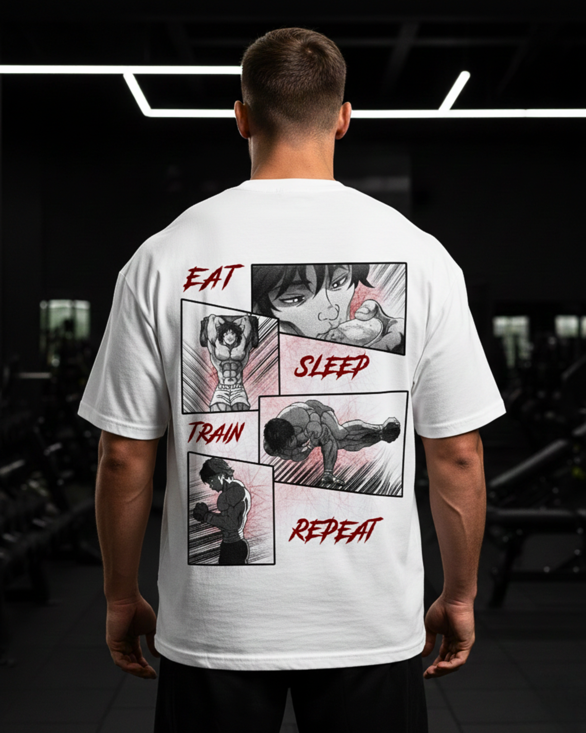 The "Eat Sleep Train Repeat" oversized shirt represents uncompromising discipline and the true gym lifestyle. The striking anime panel design on the back visualizes the cycle of success: nutrition, recovery, training – and then repeat.